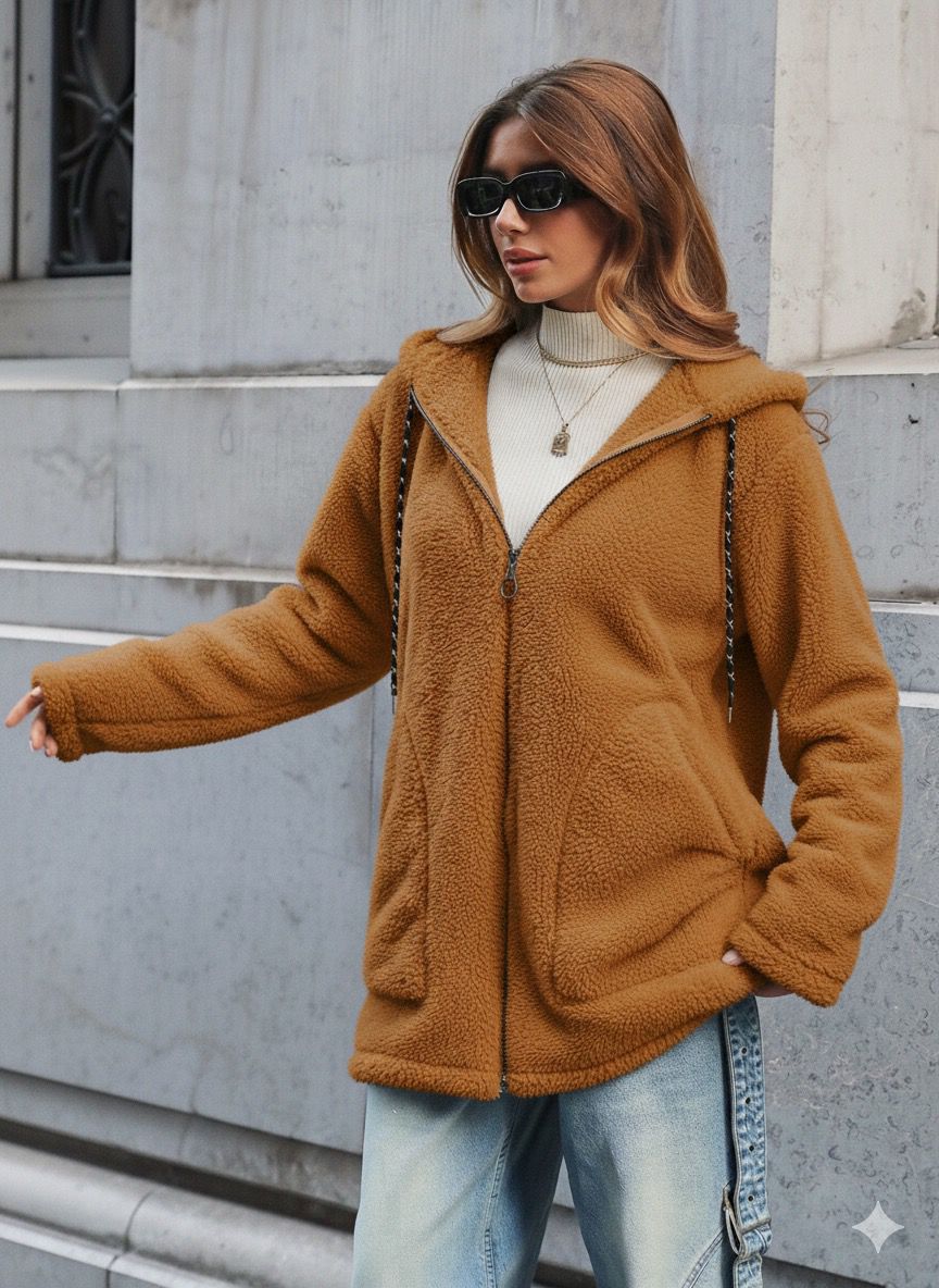Jachetă casual din blană artificială cu glugă și imprimeu digital pe piept, disponibilă în trei mărimi: S, M, L