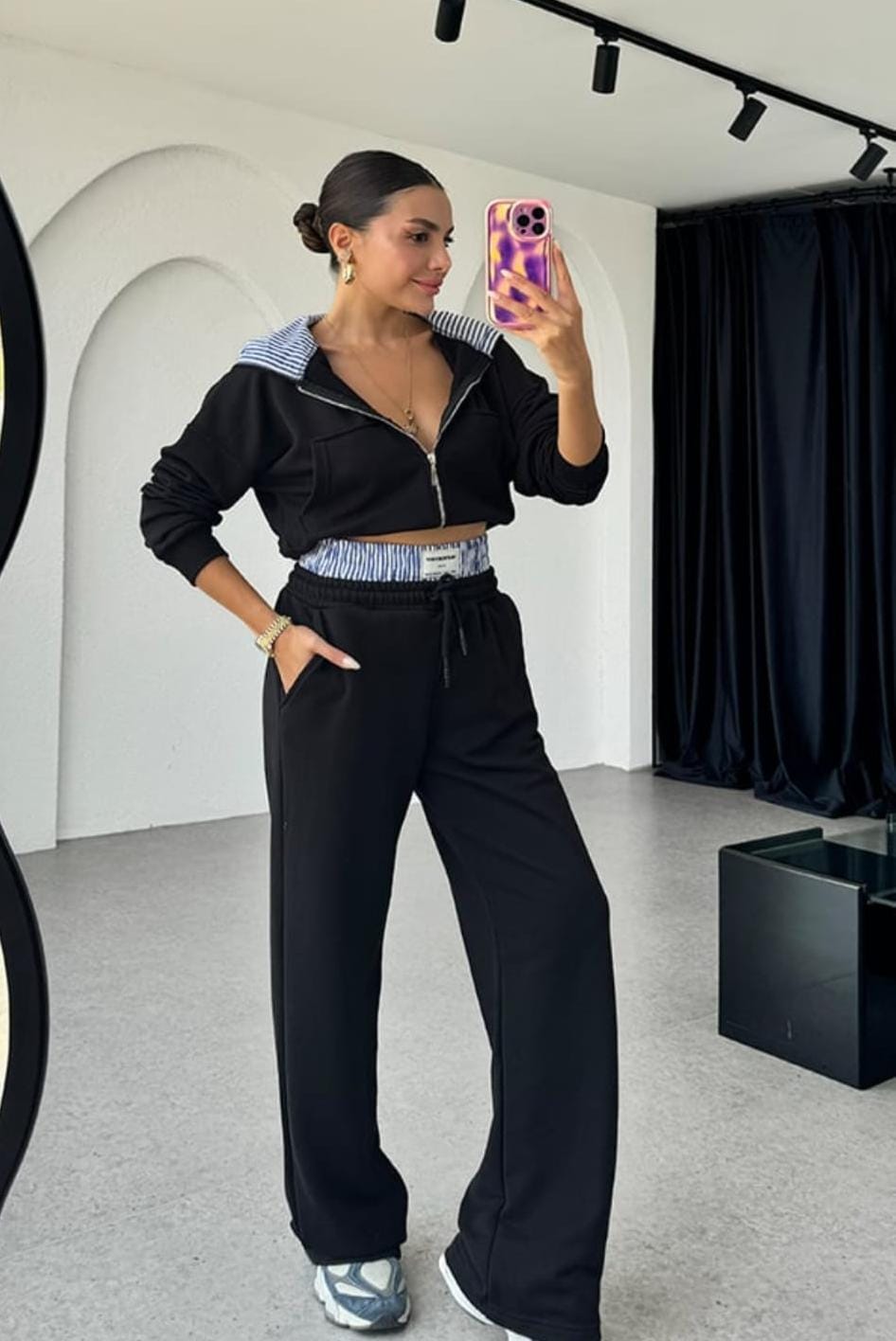 • Design: De obicei, constă dintr-un tricou sau hanorac cu fermoar/capison, asociat cu pantaloni de trening sau colanți.